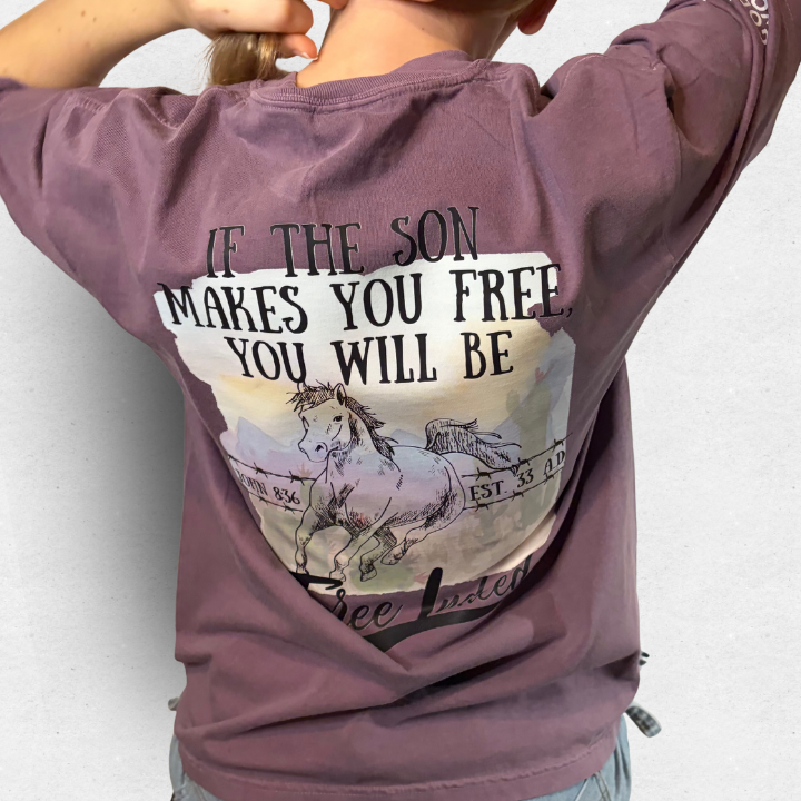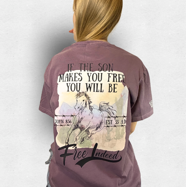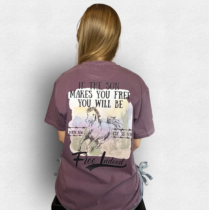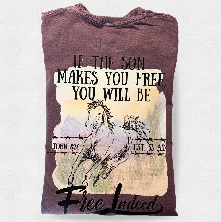 • About the design: This shirt carries the very best promise - a reminder from John 8:36 - that if Jesus frees us from our addiction, our strongholds, and from the bondage of sin and death, and hell- we are truly free! Leaning on him through difficult times is made easier by remembering that no matter what we face in this life, we are free indeed!