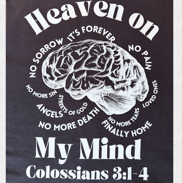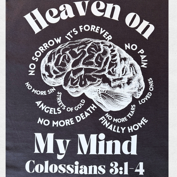 • About the design: Colossians 3:1-4 is the verse that inspired this design. This world gets heavy sometimes. God's word tells us to fight the heaviness by dwelling on things above. The brain and all the thoughts in this design represent how our minds are so very powerful. In 2 Corinthians 10:5, the bible instructs us to take each thought that come into our minds captive, because God knew that our minds could either take us down, or lift us up. This design represents a mind that is steadfastly thinking on things above.